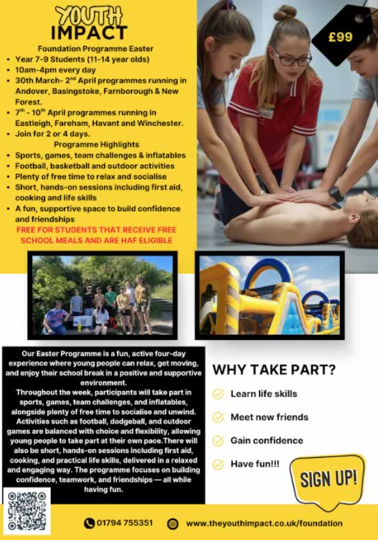 Youth Impact Found Programme - Easter 2026 Please see the poster (click to enlarge) and follow this LINK to read a letter for Parents & Carers about the upcoming Easter Events which are free for FSM students and are HAF eligible.